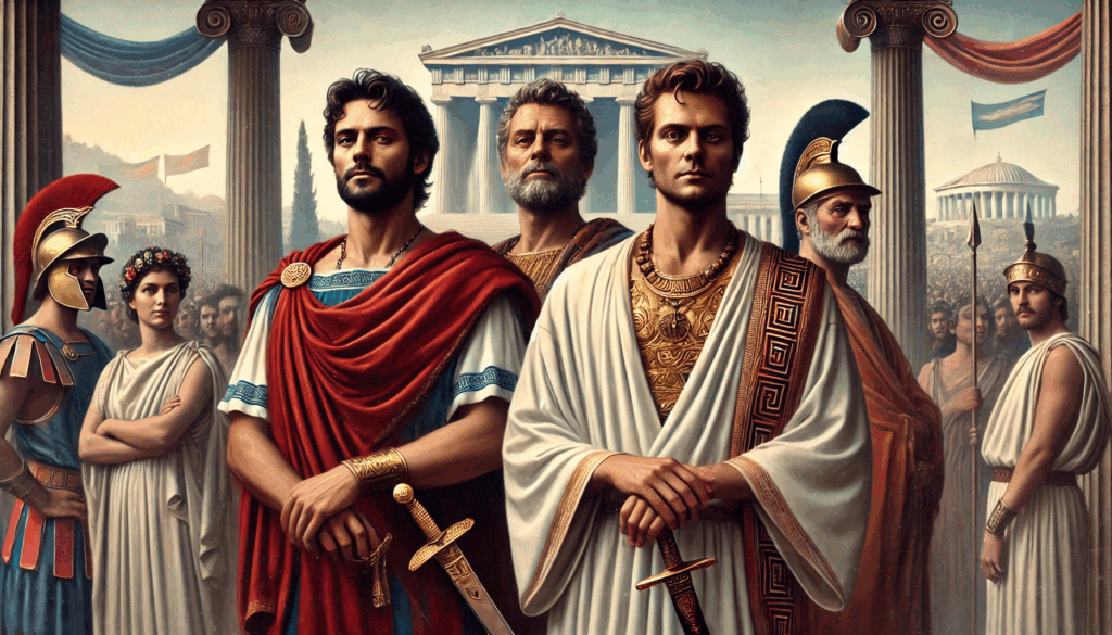BLADE IN THE FESTIVAL CROWD Harmodius and Aristogeiton stand resolute as Hipparchus, oblivious and regal, lingers nearby amid the festival banners, capturing the calm before a moment that would shake Athens.