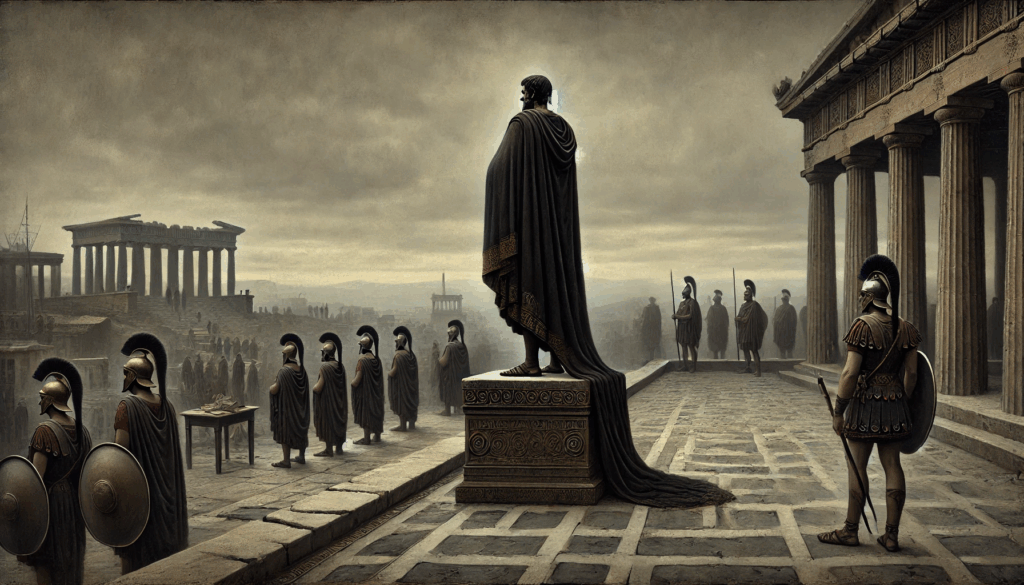 THE TYRANT’S PARANOIA Hippias stands alone in a somber Athens, cloaked in dark robes, as silence and control replace the vibrancy of his father’s rule. The city grows quiet under the weight of repression.