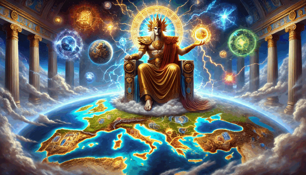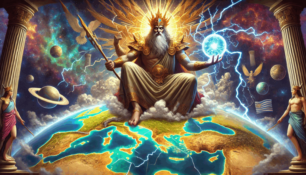 ZEUS (MARDUK) DIVIDES GREECE Above a fractured map of Greece, the cosmic figure of Marduk-Zeus looms—his lightning bolt and glowing orb symbolizing divine control over the warring city-states