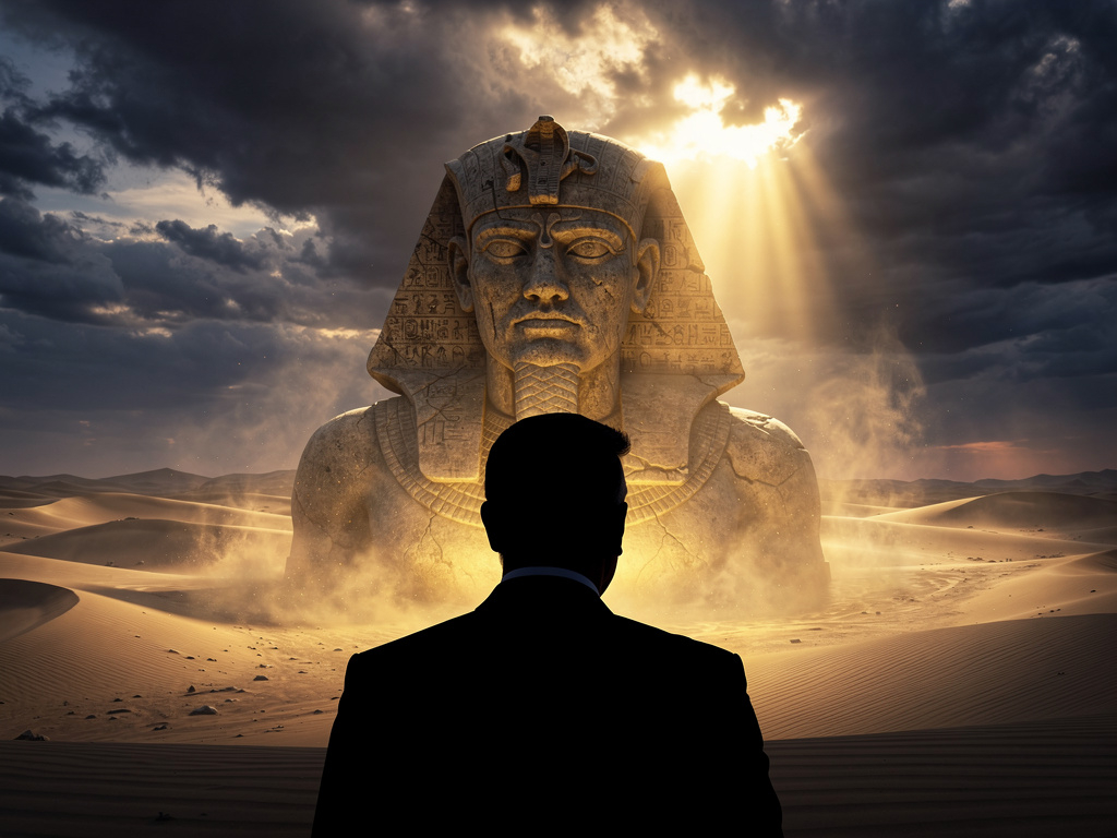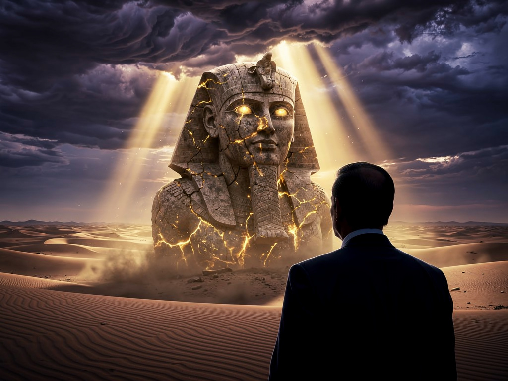 A symbolic scene blending ancient and modern. An enormous stone statue of Marduk stands half-buried in desert sands, glowing ominously in twilight. Superimposed in the foreground is the silhouette of a modern political strongman, the two shapes subtly aligning. Storm clouds gather overhead as golden light breaks through—representing the ancient domination archetype reasserting itself.