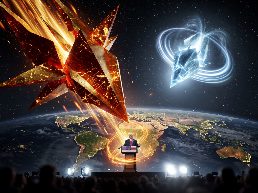realistic, photorealistic, cinematic lighting, soft natural colors, landscape, Earth at night below, two contrasting cosmic presences, fiery angular Marduk-like energy, calm luminous Enki-like energy, modern political figure on podium receiving influence, symbolic style, fantasy realism, highly detailed