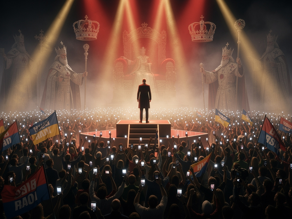 A massive rally scene blending the energy of ancient coronations with modern political fervor. A modern leader stands on a raised platform lit by dramatic beams of red and gold. Below, a chanting crowd holds up hands, flags, and phones that glow like torches. In the background, ghostlike overlays of ancient coronation ceremonies—crowns, scepters, and robes—appear faintly, showing the deep historical resonance of mass devotion.