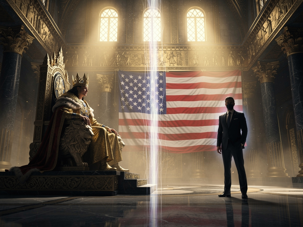 realistic, photorealistic, cinematic lighting, soft natural colors, landscape, grand ancient throne room, golden light, powerful ancient king on left in gold crown and robe, modern shadow silhouette on right before huge American flag, subtle vertical energy shimmer dividing them, fantasy realism, highly detailed, emotional depth, artistic composition