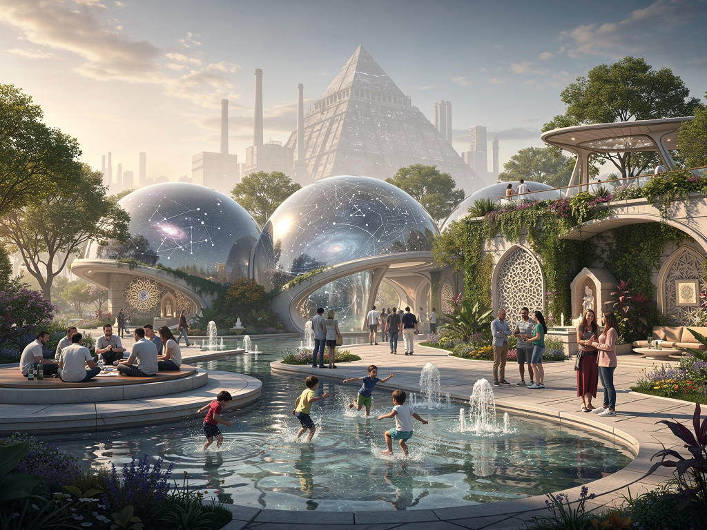 A futuristic yet earthy city that blends advanced technology with gardens, water, and sacred architecture. People of many backgrounds walk freely, collaborate, and gather in open circles; children play near fountains; transparent domes reveal star maps and cosmic vistas. In the background, the old pyramidal skyline of smokestacks and cold towers fades like a ghost. Prompt: realistic, photorealistic, cinematic lighting, soft natural colors, landscape, futuristic eco-city blending advanced tech with gardens, diverse people collaborating in open circles, children playing, fountains and star maps, faint ghosted outline of old industrial pyramidal skyline fading behind, fantasy realism, highly detailed, emotional depth, artistic composition