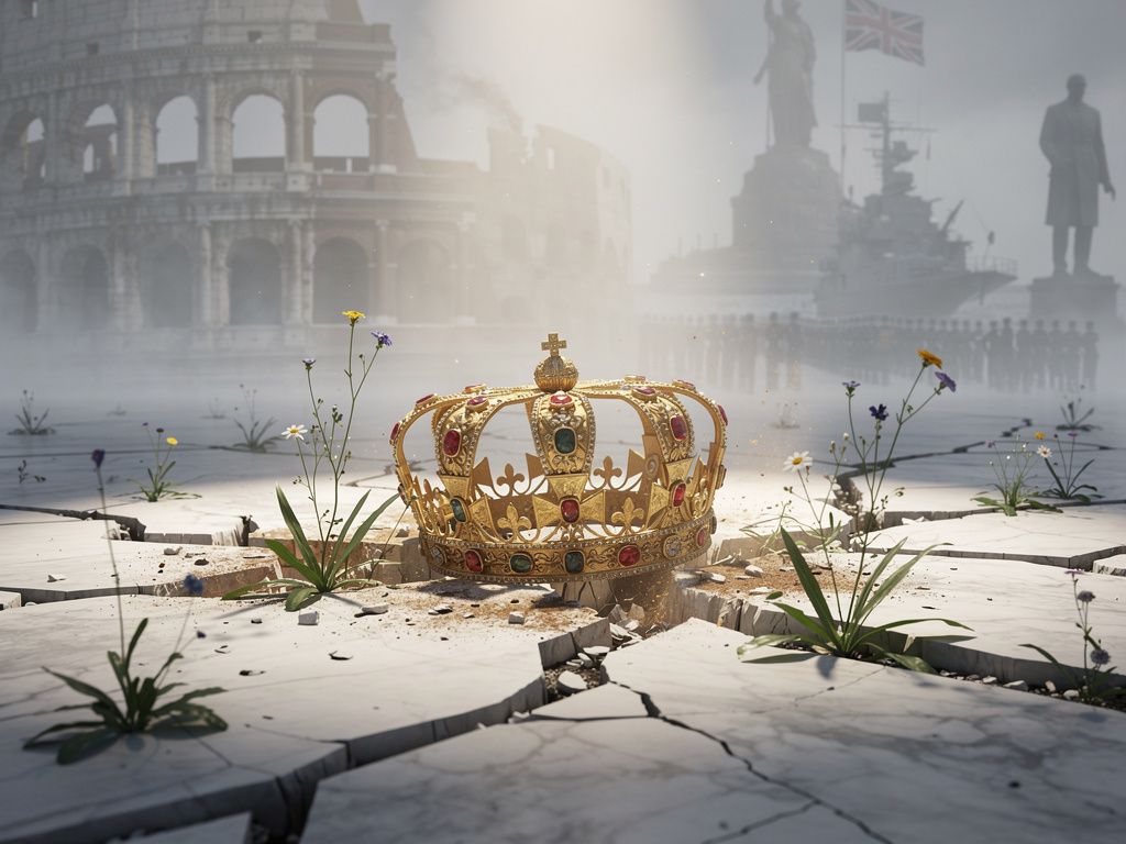 A symbolic image of a crumbling golden crown resting on cracked marble, with weeds and tiny flowers emerging through the stone. Behind it, ghostlike images of fallen empires—Rome, Britain, authoritarian regimes—fade into the background. A soft beam of light highlights the small emerging plants, representing partnership consciousness rising through the cracks.