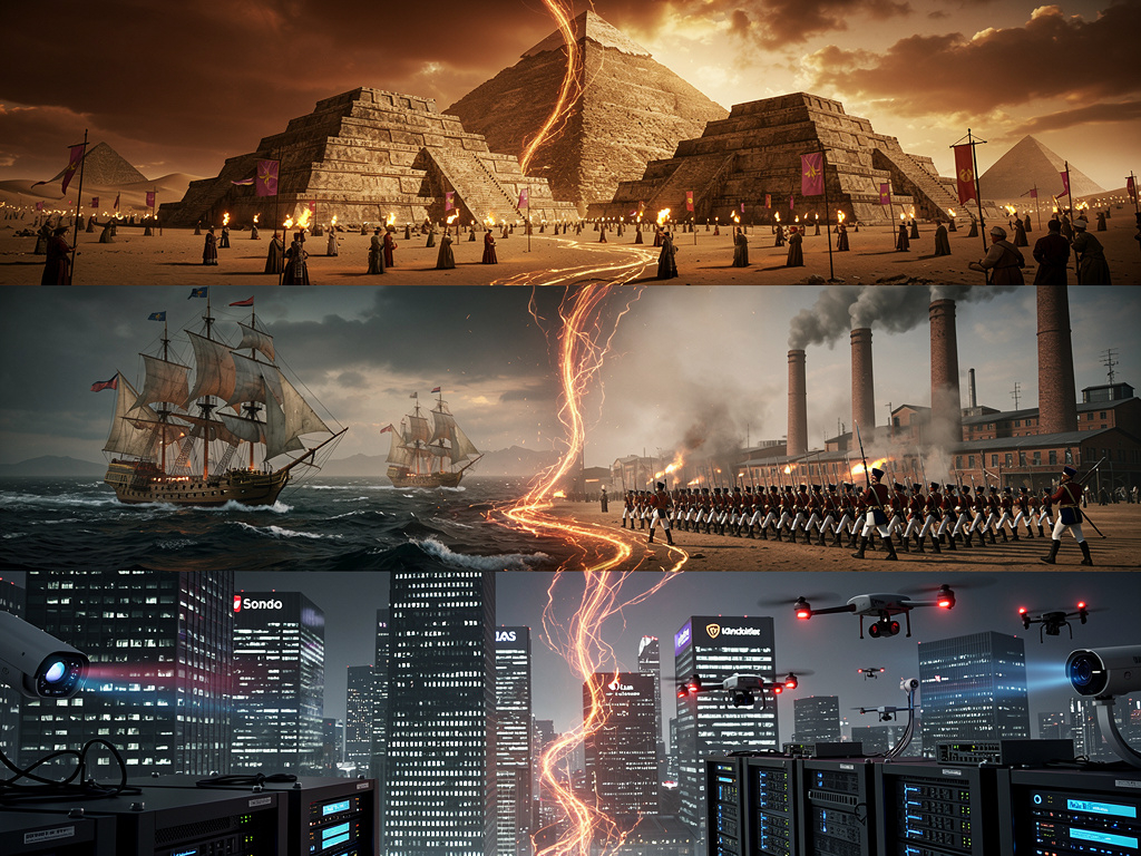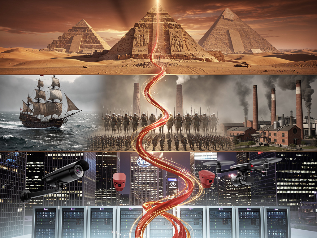 Energy flows through all three layers in a continuous red-gold stream, showing continuity of domination systems across eras.
