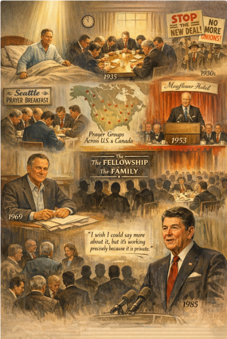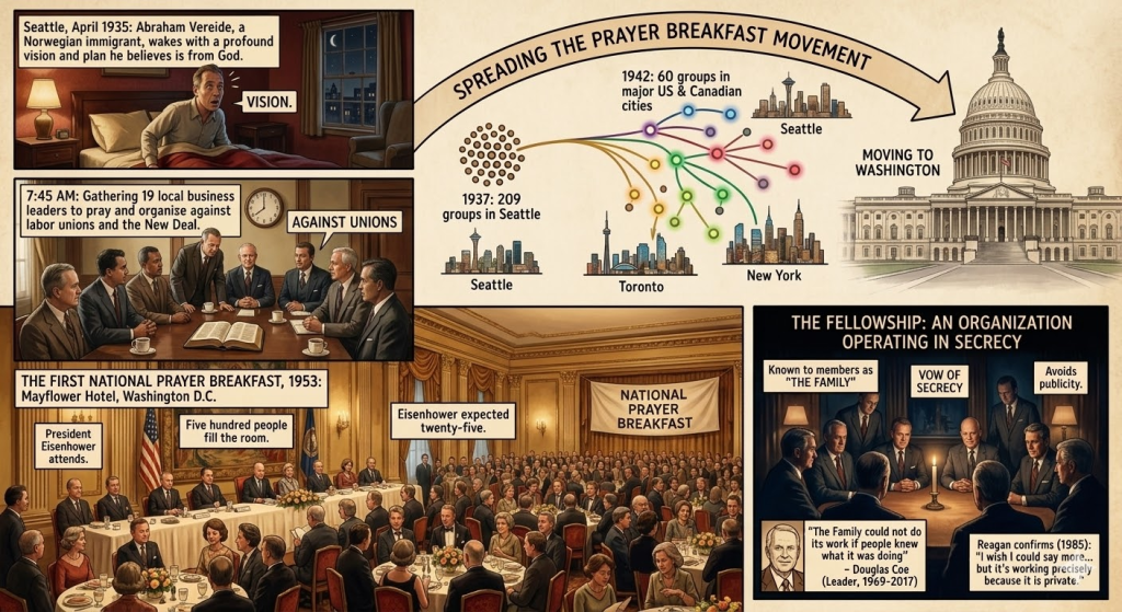 Vereide gathered nineteen local businessmen for a prayer breakfast. The 7:45 a.m. meeting time kept it from interfering with work. The agenda was direct: pray, and fight the influence of labor unions and Franklin Roosevelt’s New Deal. By 1937, 209 prayer breakfast groups operated across Seattle. By 1942, sixty groups met in major cities across the United States and Canada, including Washington, Chicago, New York, and Los Angeles. That same year, Vereide began holding prayer breakfasts for members of the House and Senate.