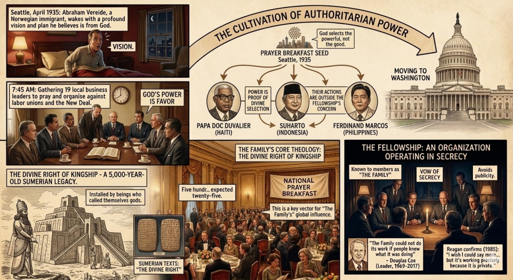 The Family’s theology held one principle above all others. God selects leaders not because they are good but because they are powerful. Power itself serves as evidence of divine selection. The organization cultivated relationships with authoritarian leaders across the globe — Papa Doc Duvalier of Haiti, Suharto of Indonesia, Ferdinand Marcos of the Philippines — on the grounds that their power proved God’s favor. Whatever they did with that power fell outside the Fellowship’s concern.