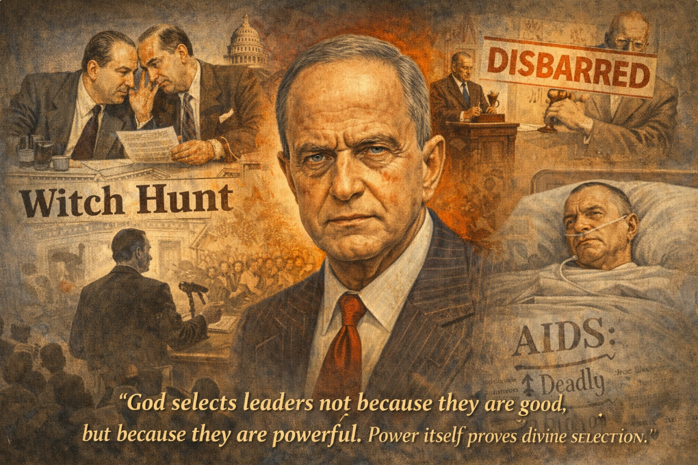Roy Cohn understood the theology of power without ever attending a prayer breakfast. Cohn made his name as Senator Joseph McCarthy’s chief counsel during the Red Scare of the early 1950s, where he helped destroy careers and lives through innuendo, fabricated evidence, and public intimidation. A federal court disbarred him in 1986 for fraud, professional misconduct, and misappropriation of client funds. He died of AIDS that same year, having denied both his illness and his homosexuality to the end.