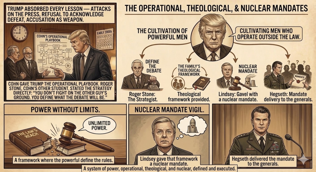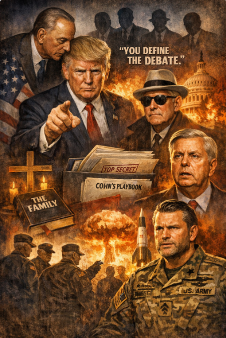 Cohn gave Trump the operational playbook. The Family gave the operation a theological framework. Lindsey gave that framework a nuclear mandate. And Hegseth delivered the mandate to the generals.