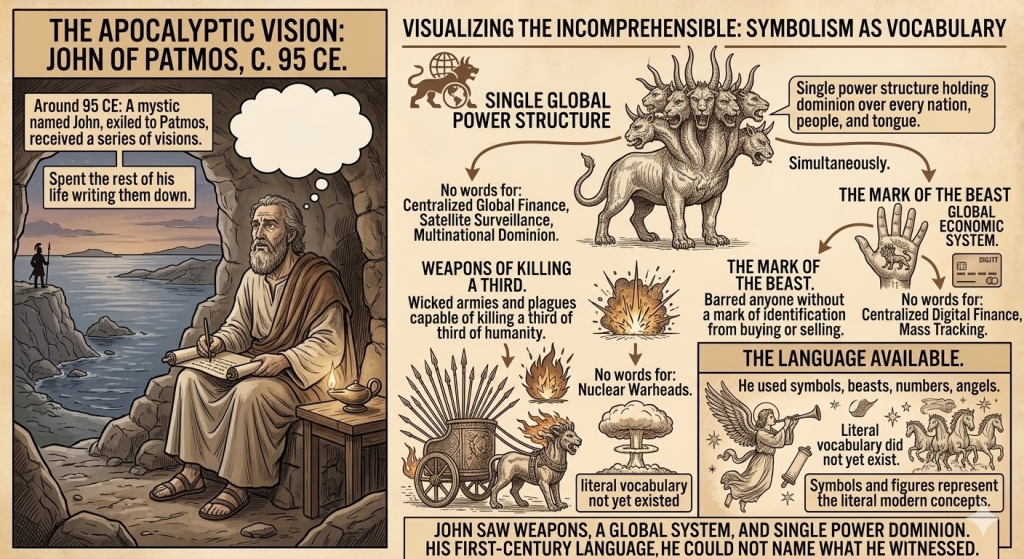 John had no words for nuclear warheads, satellite surveillance, or centralized global finance. He used the only language available to a first-century man — symbols, beasts, numbers, angels — because the literal vocabulary for what he witnessed did not yet exist.