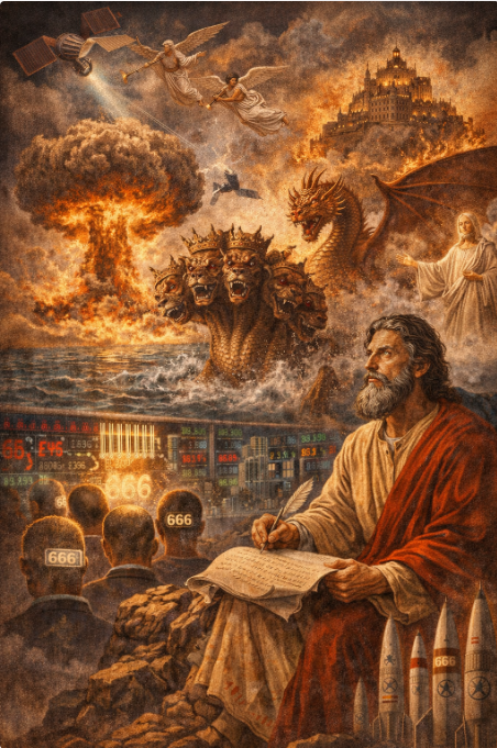 Around 95 CE, a Jewish Christian mystic named John — exiled by the Roman Emperor Domitian to the island of Patmos in the Aegean Sea — received a series of visions and spent the rest of his life writing them down. What he saw bore no resemblance to anything in his first-century world. He described weapons capable of killing a third of humanity in a single event, a global economic system that barred anyone without a mark of identification from buying or selling, and a single power structure holding dominion over every nation, people, and tongue on Earth simultaneously.