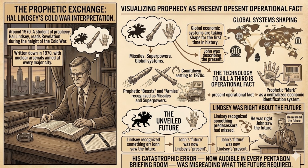 Writing in 1970, with nuclear arsenals aimed at every major city on Earth, Lindsey read Revelation and recognized something his predecessors had missed: John was describing the present. Missiles. Superpowers. Global economic systems are taking shape for the first time in history. The technology to kill a third of humanity in a single exchange had moved from prophetic symbol to operational fact.