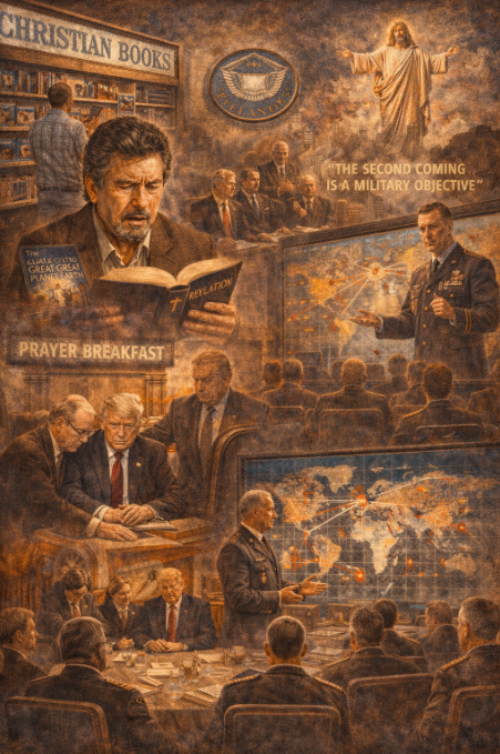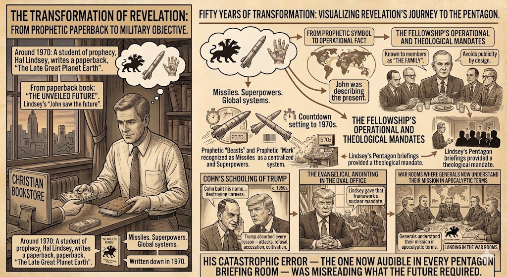 Fifty years from a Christian bookstore paperback to a Defense Secretary announcing the Second Coming as a military objective. Revelation traveled that distance through Vereide’s prayer breakfasts, Lindsey’s Pentagon briefings, Cohn’s schooling of Trump, and the evangelical anointing in the Oval Office before landing in the war rooms where generals now understand their mission in apocalyptic terms.