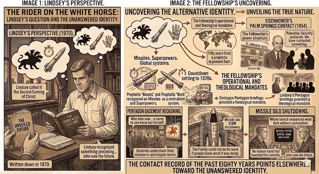 The question Lindsey never asked — and the one this series pursues — is who John actually saw descending on that white horse with eyes like flames and a name no one knew but himself. Lindsey called it the Second Coming of Christ. The contact record of the past eighty years points elsewhere. Toward Eisenhower’s Palm Springs. The basement of the Pentagon. The missile silos across the American heartland where launch sequences went dark without explanation, and no human hand had touched the controls.