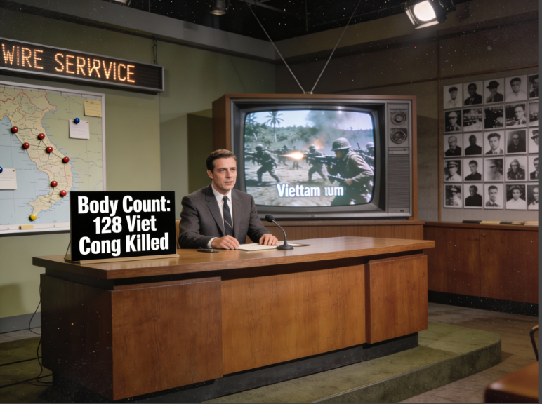 Television news as the primary battlefield of persuasion during Vietnam. Realistic 1960s television newsroom, Vietnam War broadcast, body count graphics.