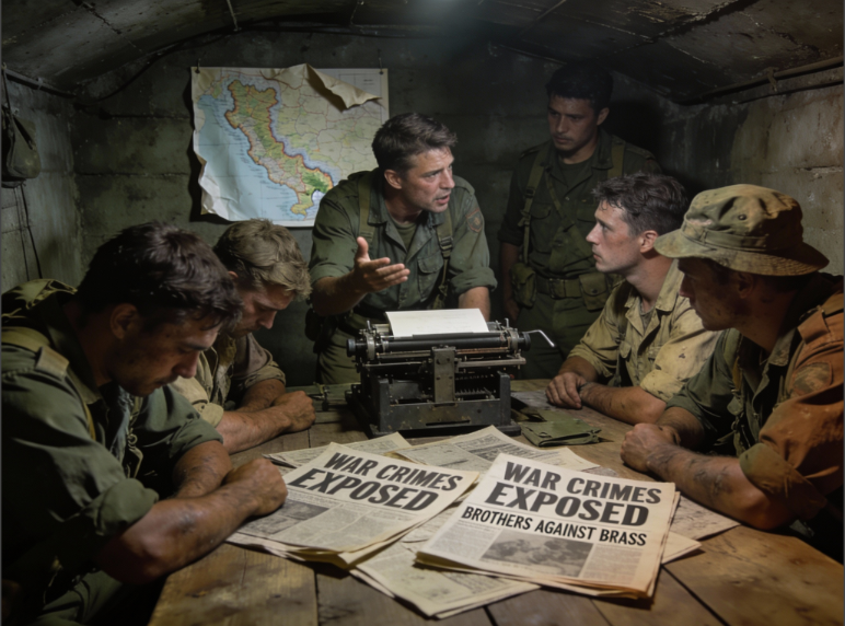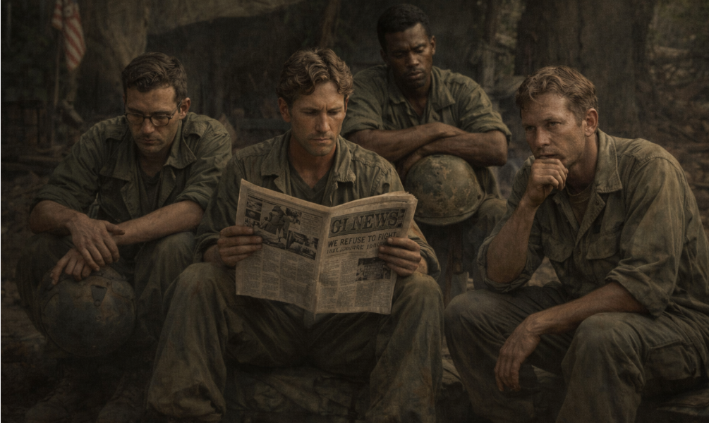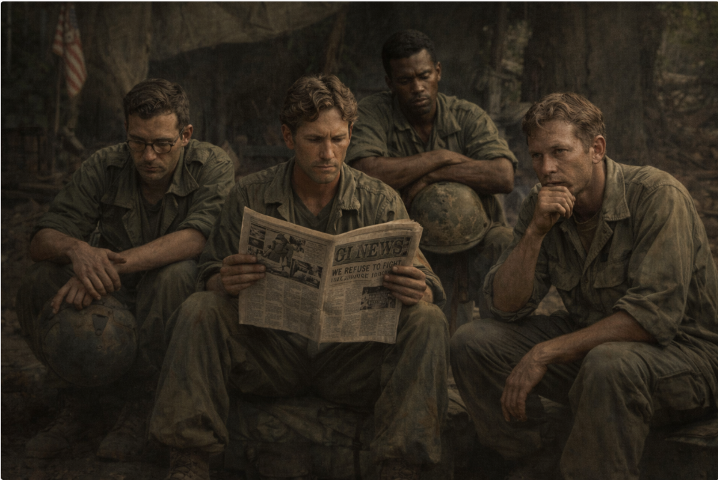 The war fracturing internally among those ordered to fight it. Realistic Vietnam-era military scene, GI underground press, disillusioned soldiers