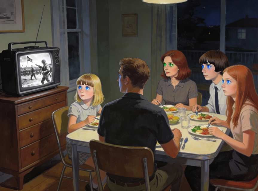A 1960s American dining room at night. A family sits silently around a table while a black-and-white television glows in the background, displaying a news broadcast. A young girl watches intently, eyes fixed on the screen, while adults avert their gaze.