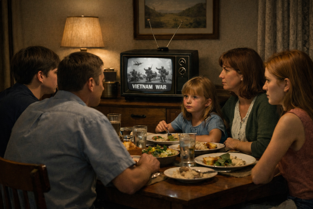 A 1960s American dining room at night. A black-and-white television glows with Vietnam War news. A young girl watches intently while adults sit silently, tense and conflicted.