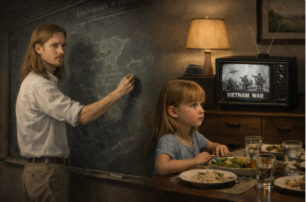 This account brings together two perspectives shaped by that war. One is analytical, formed by an anthropologist who, as a young college professor in Hawaii during the Vietnam era, observed how power manufactures consent through policy, media, and myth. The other is experiential, formed by a child fourteen years younger, sitting at a dining room table night after night, watching the war arrive through a television screen and learning—far too early—how death could be normalized through numbers.