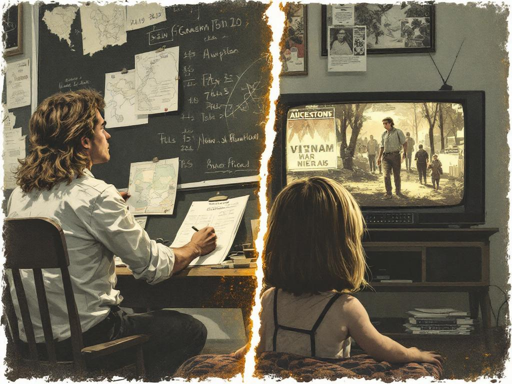 Conceptual realistic illustration, split scene composition, 1960s professor with chalkboard maps and dates, young girl watching Vietnam War news on television, emotional continuity, muted tones, historical realism, landscape orientation