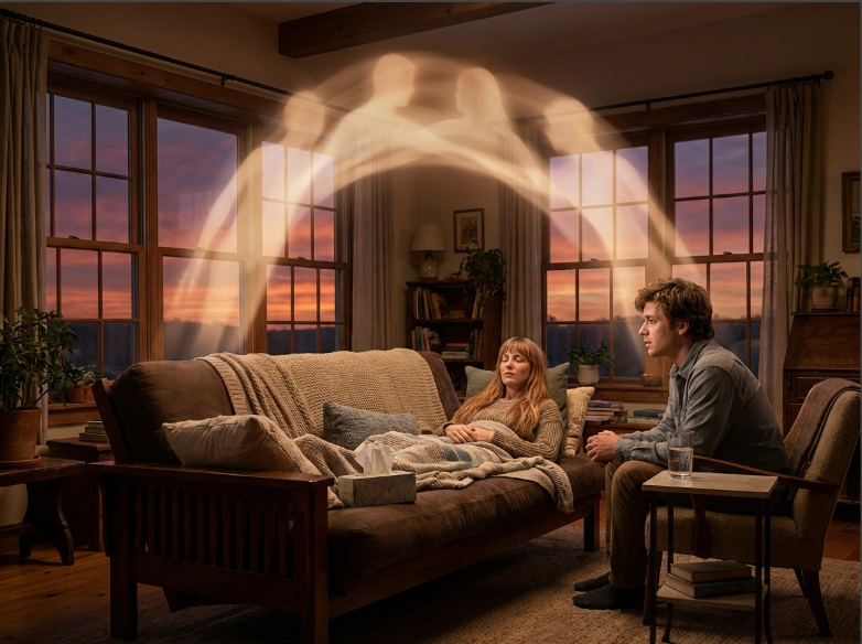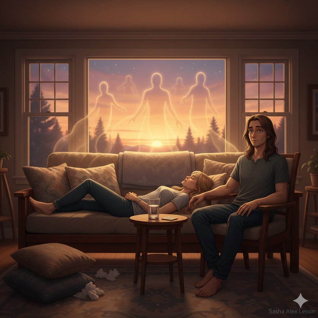 A photorealistic, cinematic wide-angle banner of a cozy living room at dusk with large windows glowing with deep sunset color. A comfortable futon centered in the room with pillows and tissues nearby. Janet lies on the futon, eyes closed in calm focus—attractive, youthful, looks about 40, long sandy-blonde hair with bangs, blue eyes, gentle features. Sasha sits beside her in a chair—handsome, youthful, longish brown hair, big expressive blue eyes, calm protective posture. A glass of water sits on a side table. Above them, a subtle, respectful veil of spirit presence forms—soft translucent human silhouettes made of warm light, gentle “ghosts,” not scary. Mood: investigative, sacred, compassionate. Ultra-detailed, sharp focus, cinematic lighting, soft natural colors, fantasy realism. Landscape 16:9.