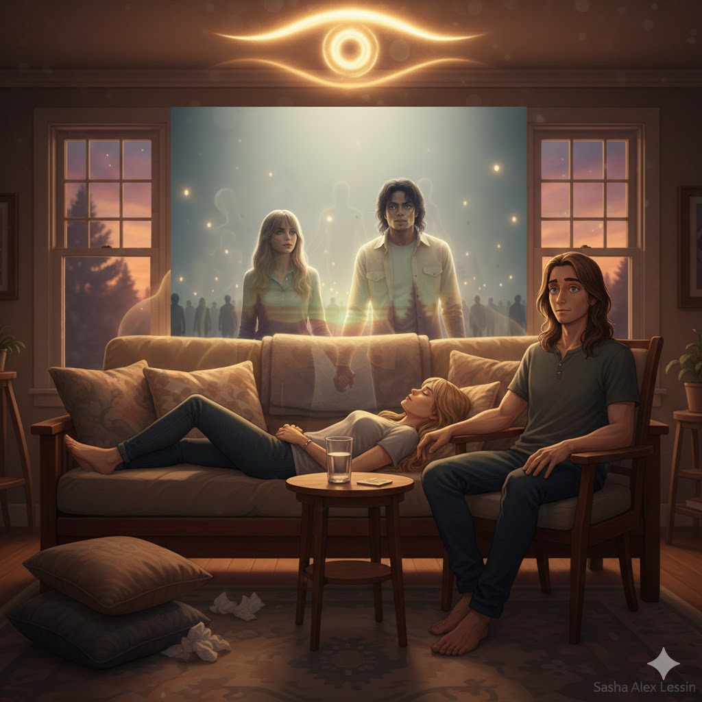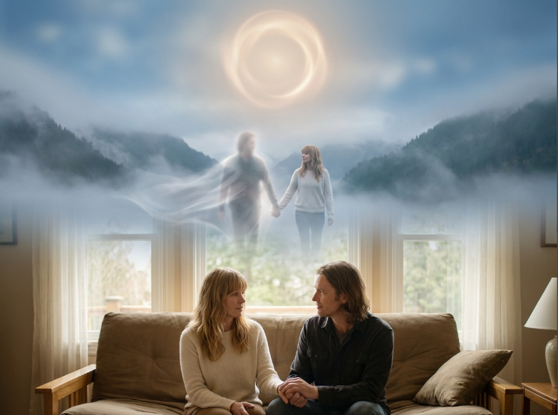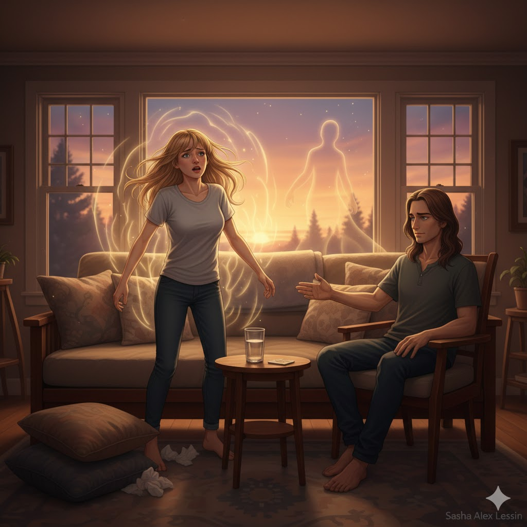 DESCRIPTION: Janet and Sasha in their living room at dusk—an intimate, cinematic “bridge between worlds” moment as spirit light gathers above them.