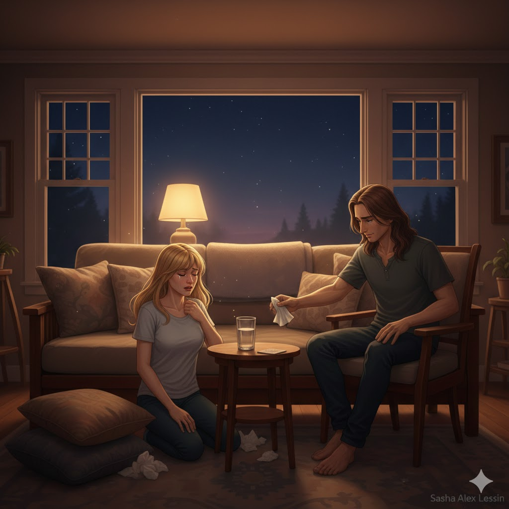 Photorealistic cinematic interior: Janet kneels near the futon, respectfully portrayed in intense grief—no grotesque crying—just powerful emotion. Tissues and water within reach. Sasha calmly offers a tissue and steadies her with supportive presence, eyes kind and focused. Warm lamplight, sunset darkness outside the windows. Ultra-detailed, sharp focus, soft natural colors, emotional realism. Landscape 16:9.