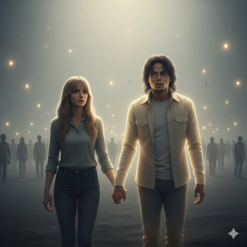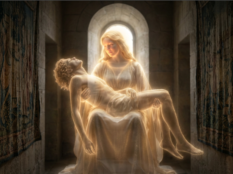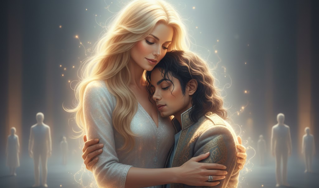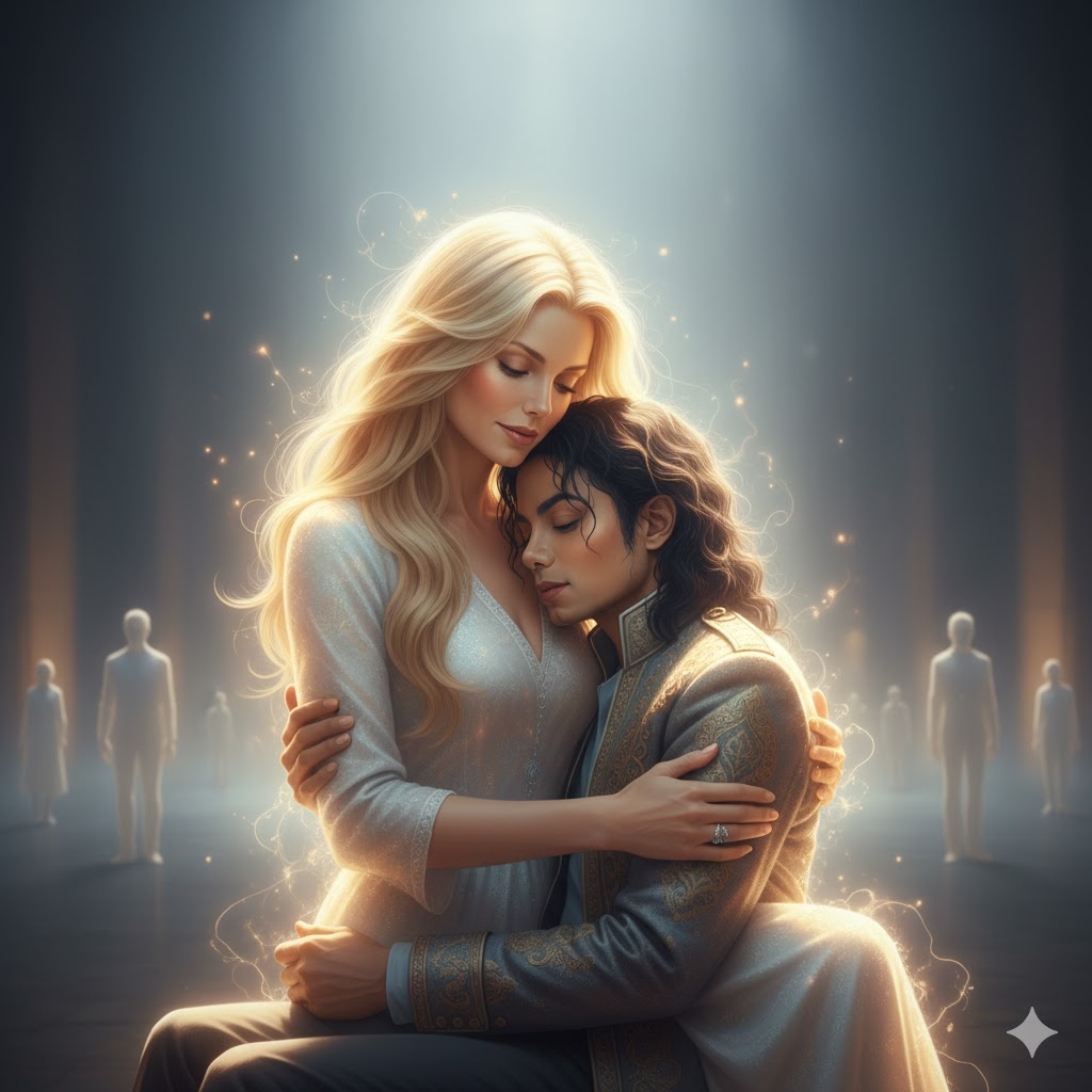 Cinematic photoreal symbolic vision in a soft, dim transitional space: a luminous blonde female spirit presence (Farrah-inspired but not an exact likeness) cradles a slender male spirit presence (Michael-inspired but not an exact likeness) in a gentle Pietà-like pose. Both are semi-translucent, made of warm light with soft edges and compassionate expressions. No fear, no gore—pure comfort and shock-to-care transition. Ultra-detailed, cinematic lighting, soft natural colors, fantasy realism, sharp focus. Landscape 16:9.