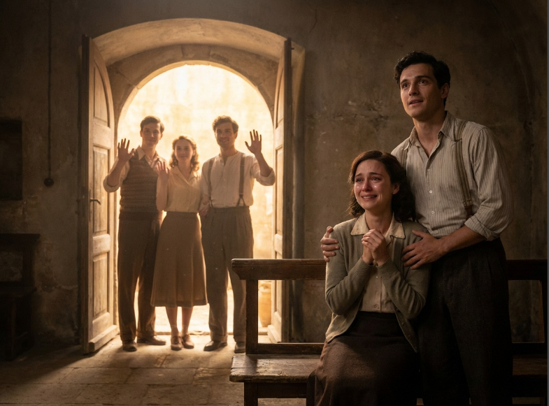 Cinematic photoreal vision scene: a doorway of soft light opens in a dim transitional realm and four figures step through, appearing youthful (mid-20s/early-30s), healthy, warmly radiant. They wave gently, loving and reassuring. In the foreground, Janet reacts with joyful tears; Sasha watches in awe, steady and protective. Ultra-detailed, sharp focus, cinematic lighting, soft natural colors. Landscape 16:9.