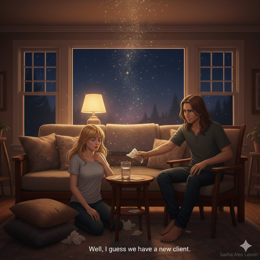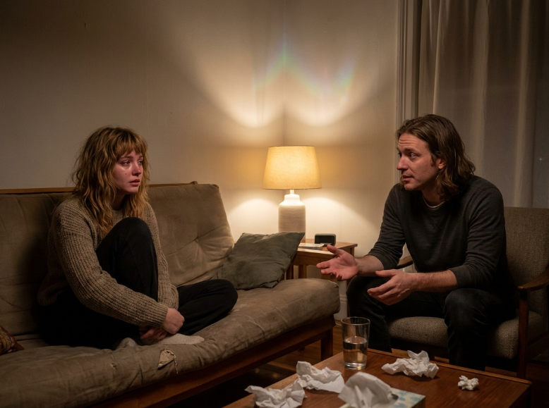 Photorealistic cinematic living-room scene late at night: tissues scattered, water glass half-full, warm lamp light. Janet sits exhausted on the futon, youthful and pretty with sandy-blonde bangs, eyes wet but calm; Sasha sits nearby, handsome, longish brown hair, expressive blue eyes, compassionate and slightly incredulous. A barely-visible shimmer of spirit light dissipates near the ceiling—subtle and respectful. Ultra-detailed, sharp focus, soft natural colors. Landscape 16:9.
