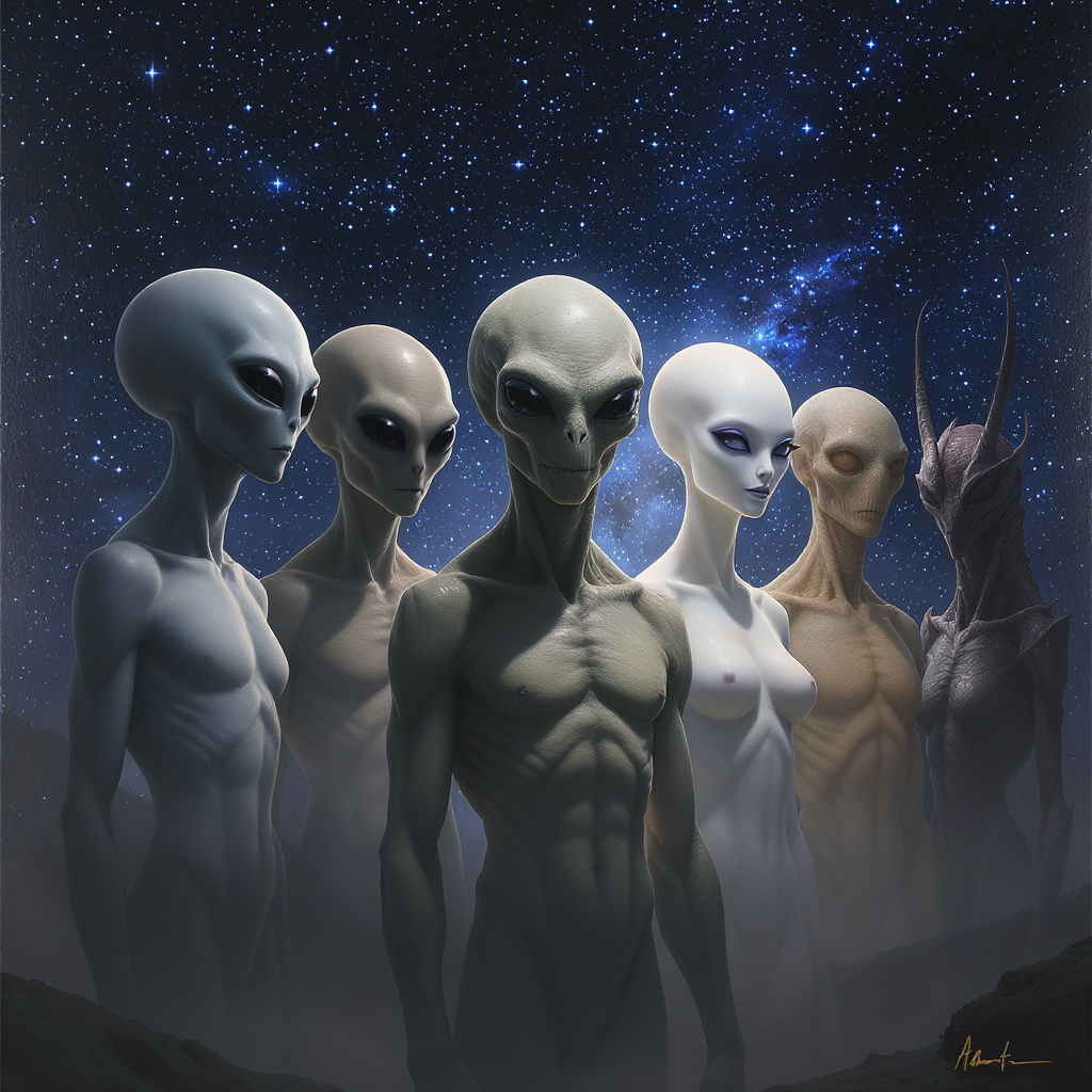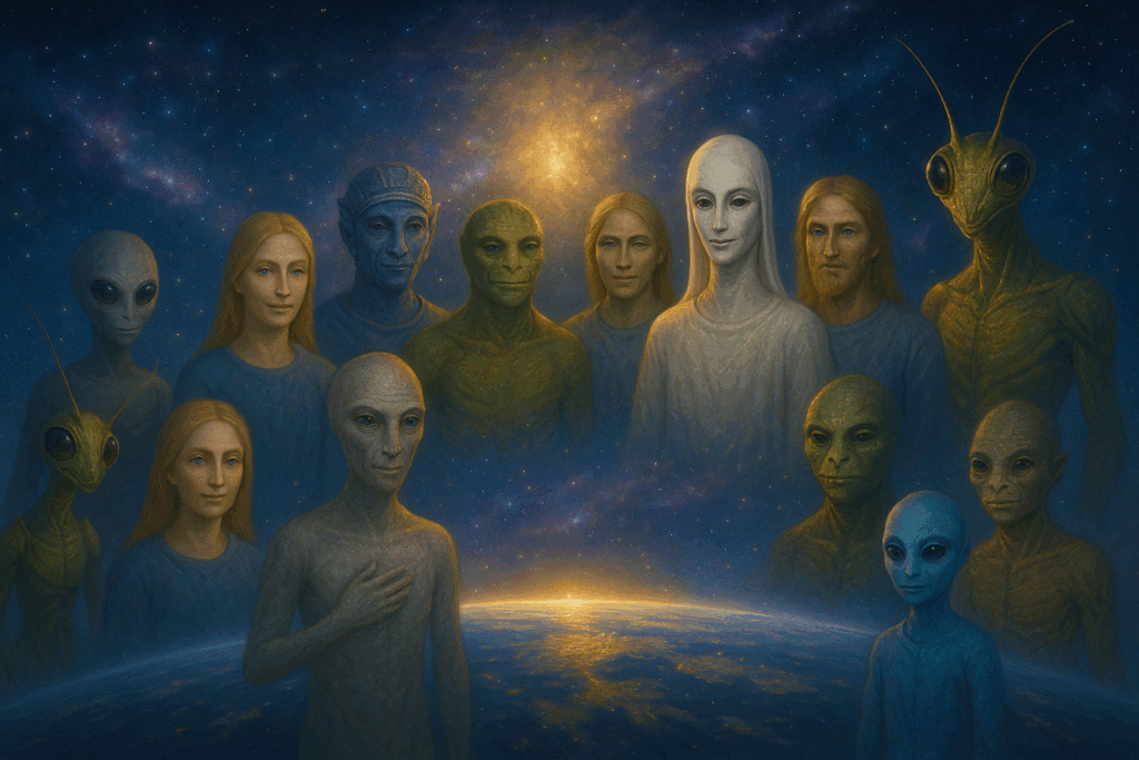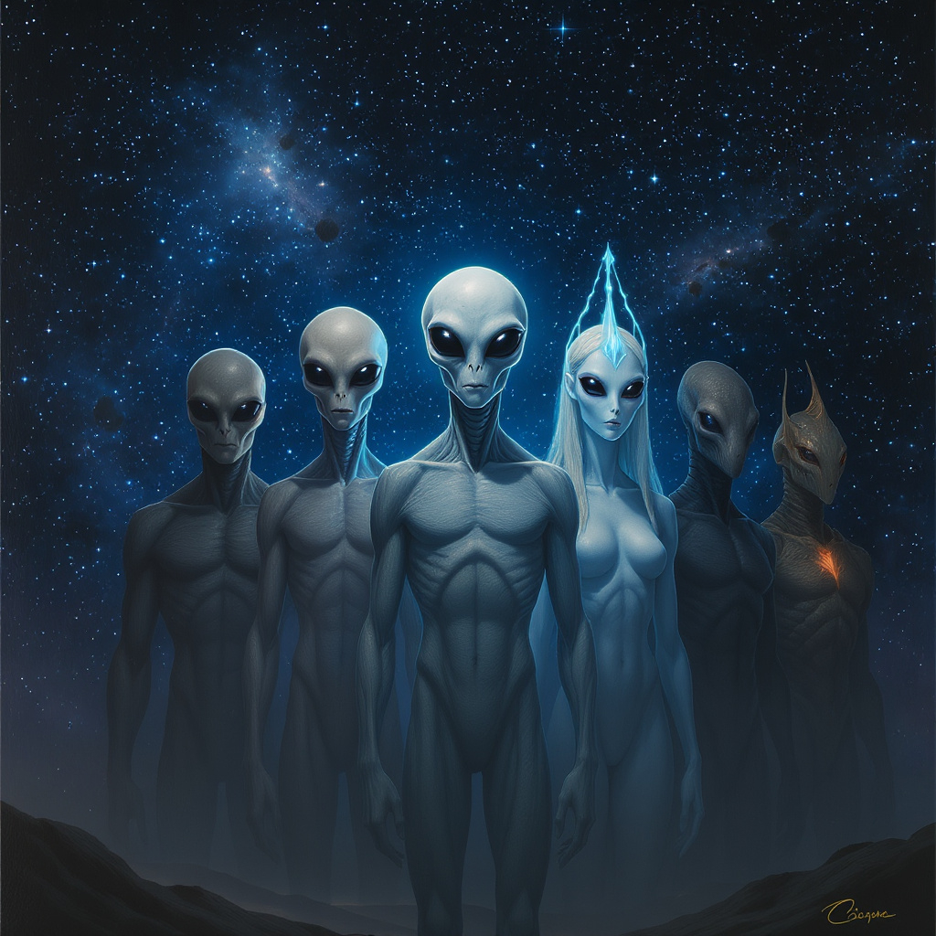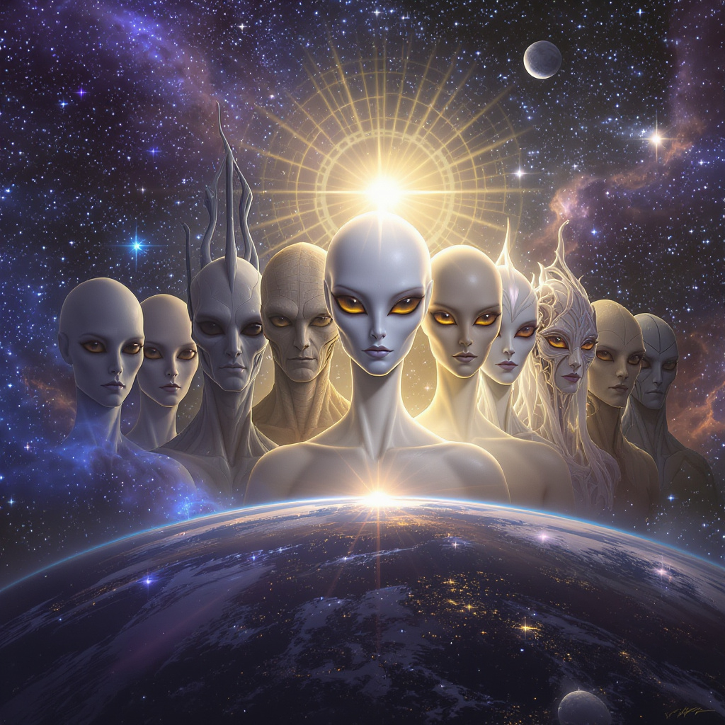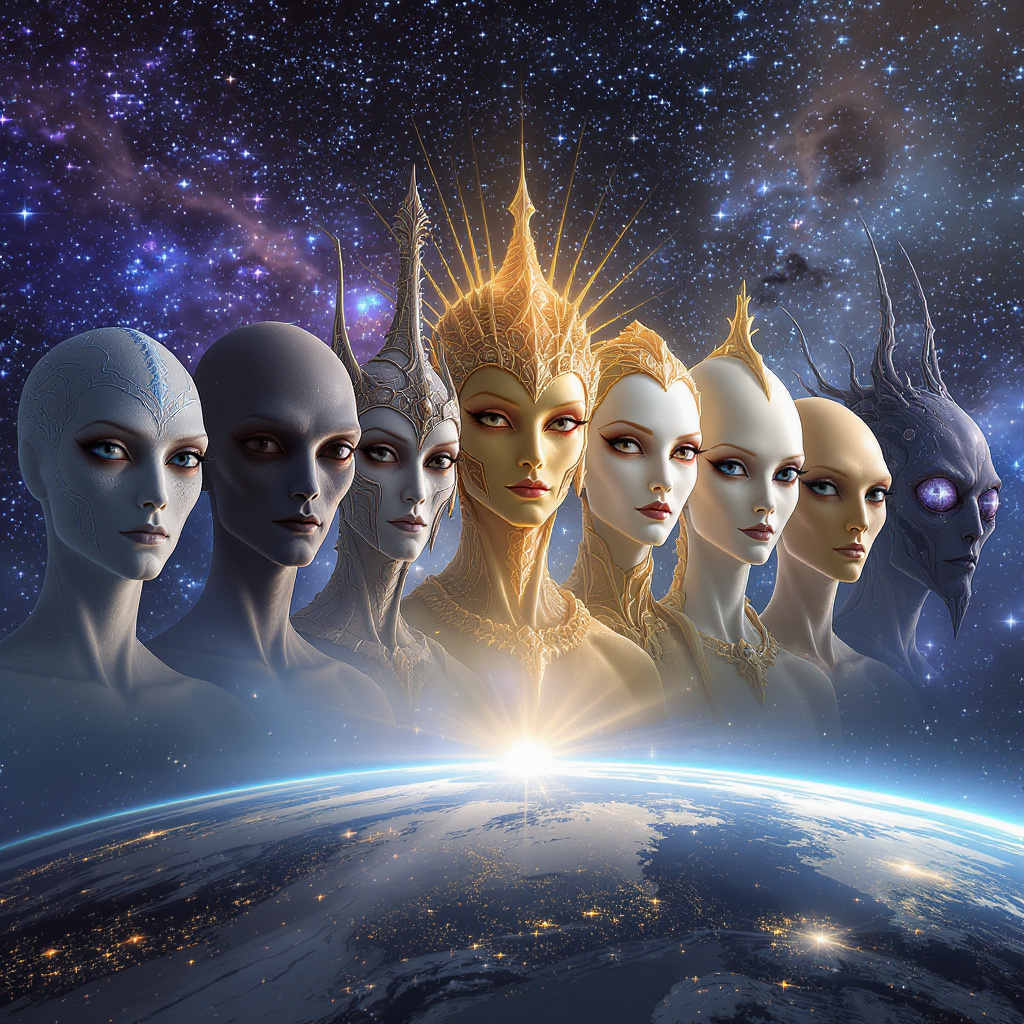 Six extraterrestrial beings—Nordic, Grey, Reptilian, Pleiadian, Andromedan, and Mantis—stand together in harmony before a cosmic backdrop. Their presence symbolizes the diverse lineages woven into humanity’s DNA.