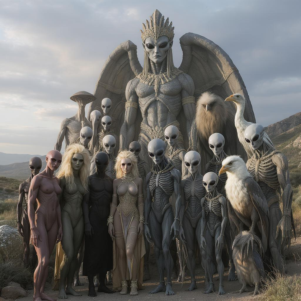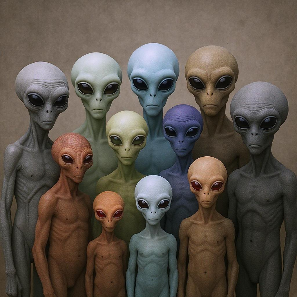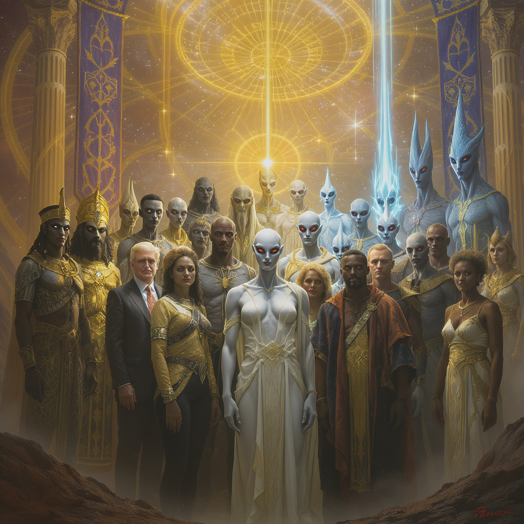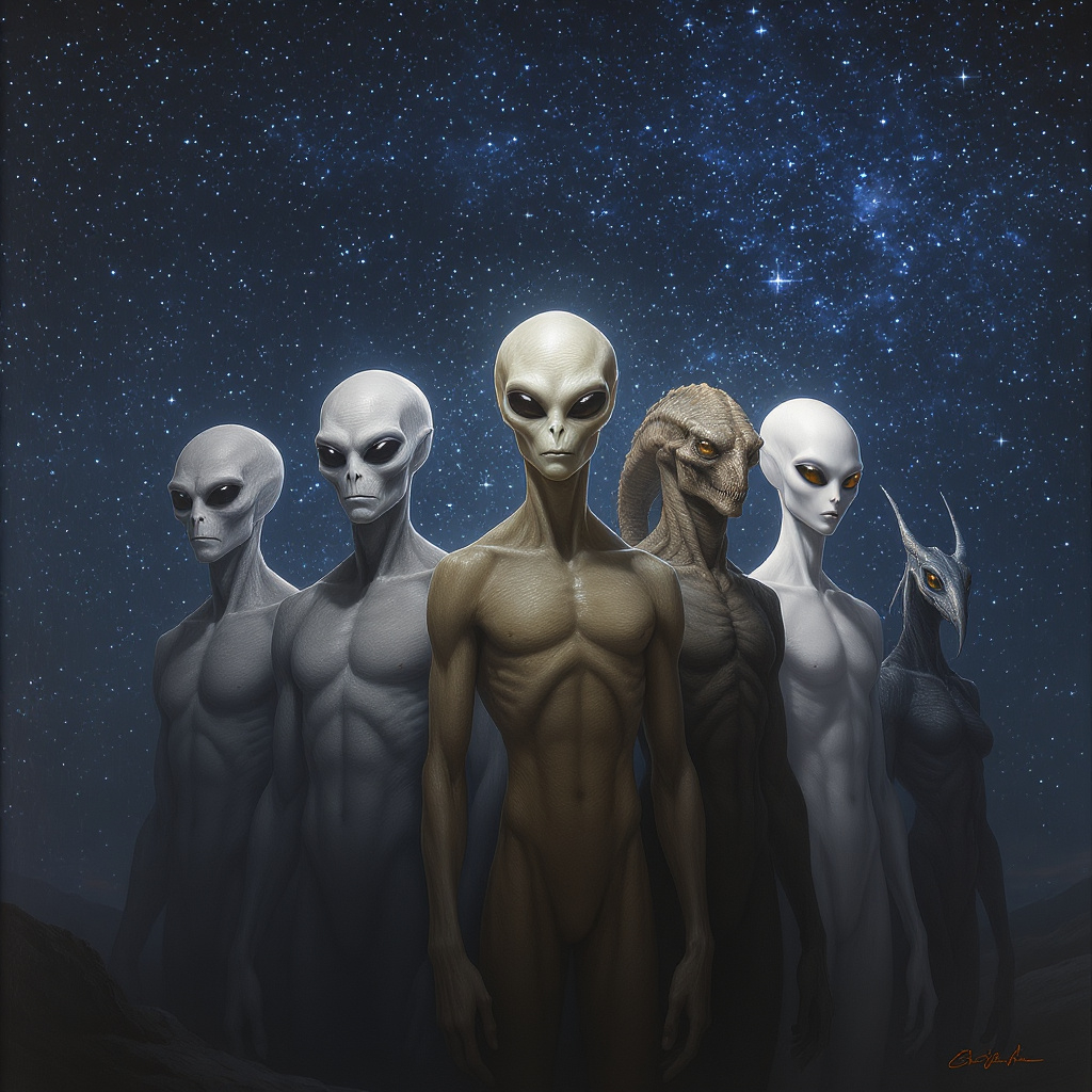 Six extraterrestrial beings—Nordic, Grey, Reptilian, Pleiadian, Andromedan, and Mantis—stand together in harmony before a cosmic backdrop. Their presence symbolizes the diverse lineages woven into humanity’s DNA.