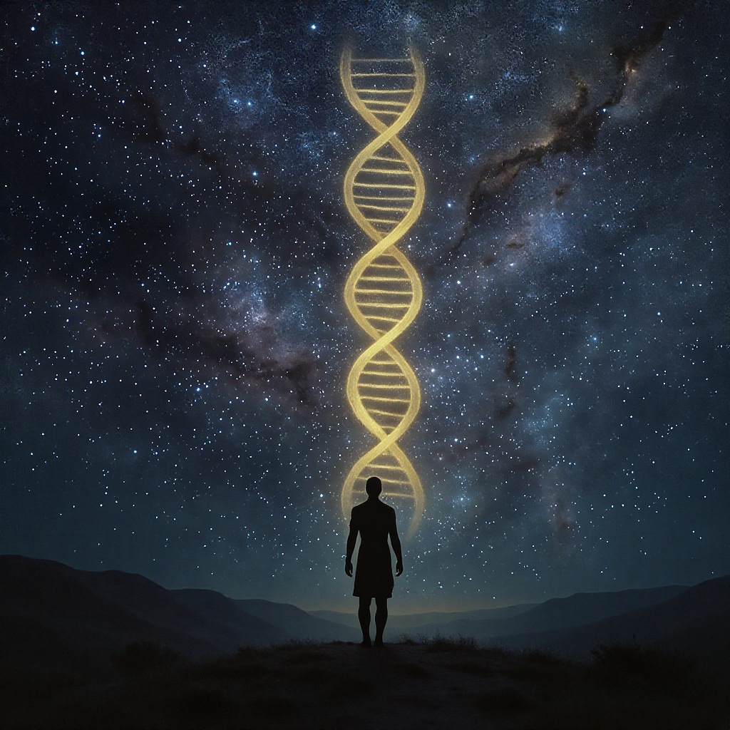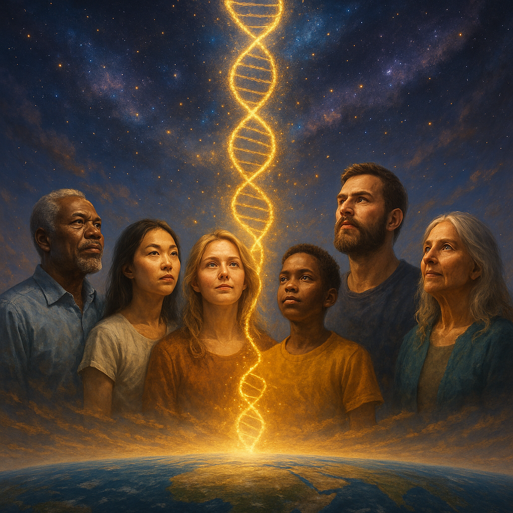 A diverse group of people stands together on Earth, illuminated by a spiraling golden DNA strand that rises into the stars. Their unified presence symbolizes humanity’s role as the living link between Earth and the cosmos.