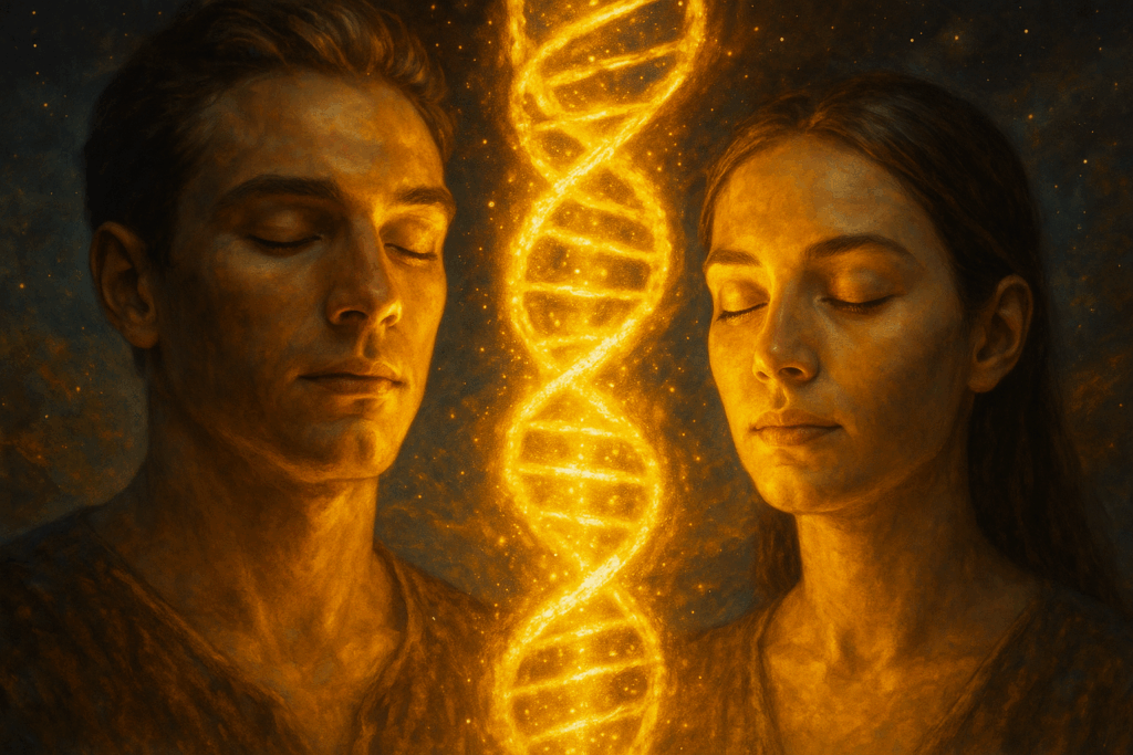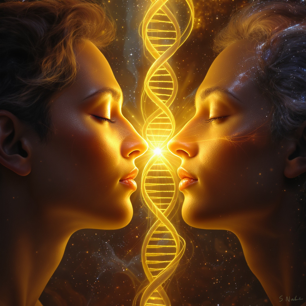 Close-ups of a man and a woman, and another with two women, their faces illuminated by the golden glow of a spiraling DNA helix between them, all with serene expressions. The cosmic backdrop symbolizes humanity’s awakening through the Meta gene.