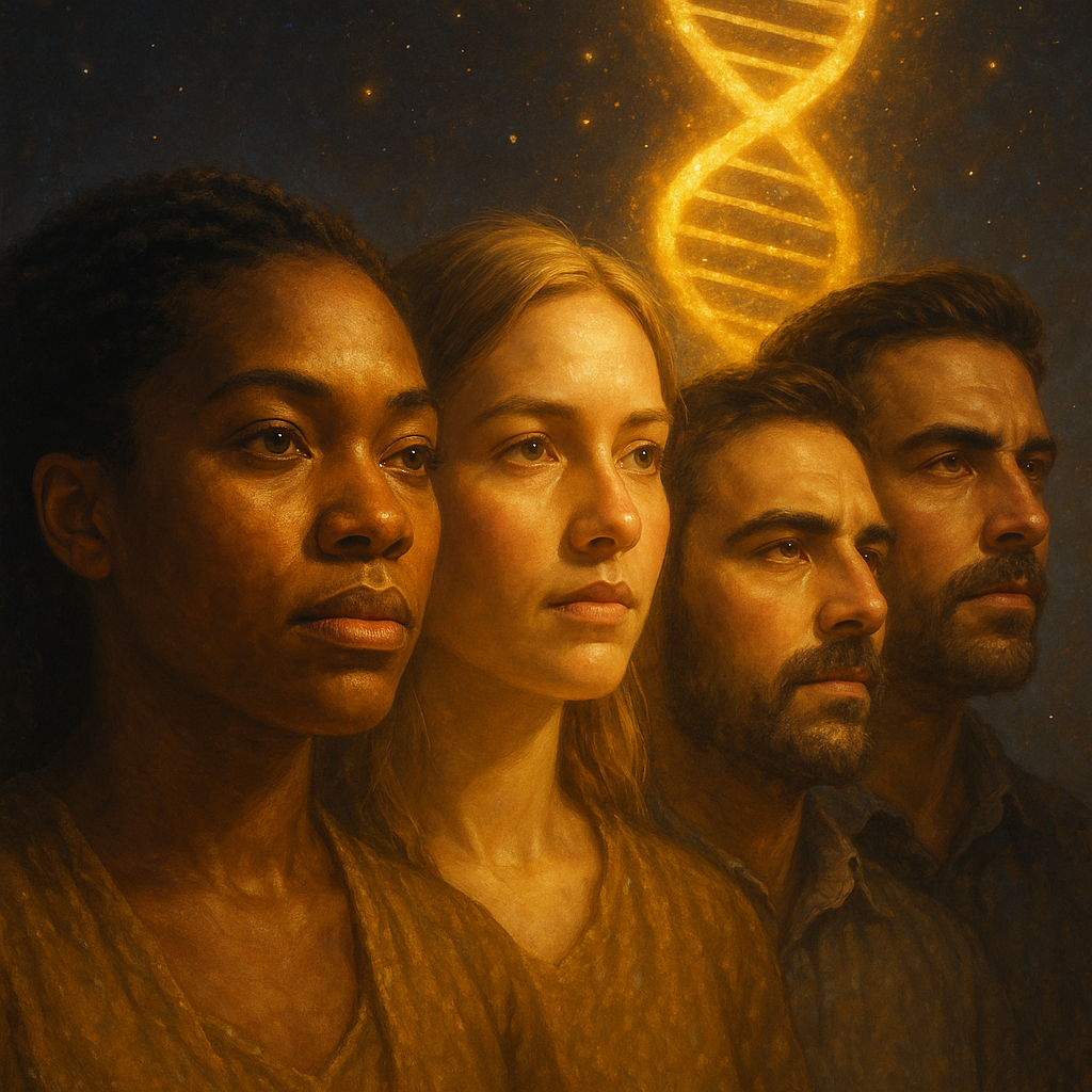 A close-up of diverse human faces illuminated by the golden glow of a spiraling DNA strand, their expressions calm, determined, and filled with purpose as they look toward the future.