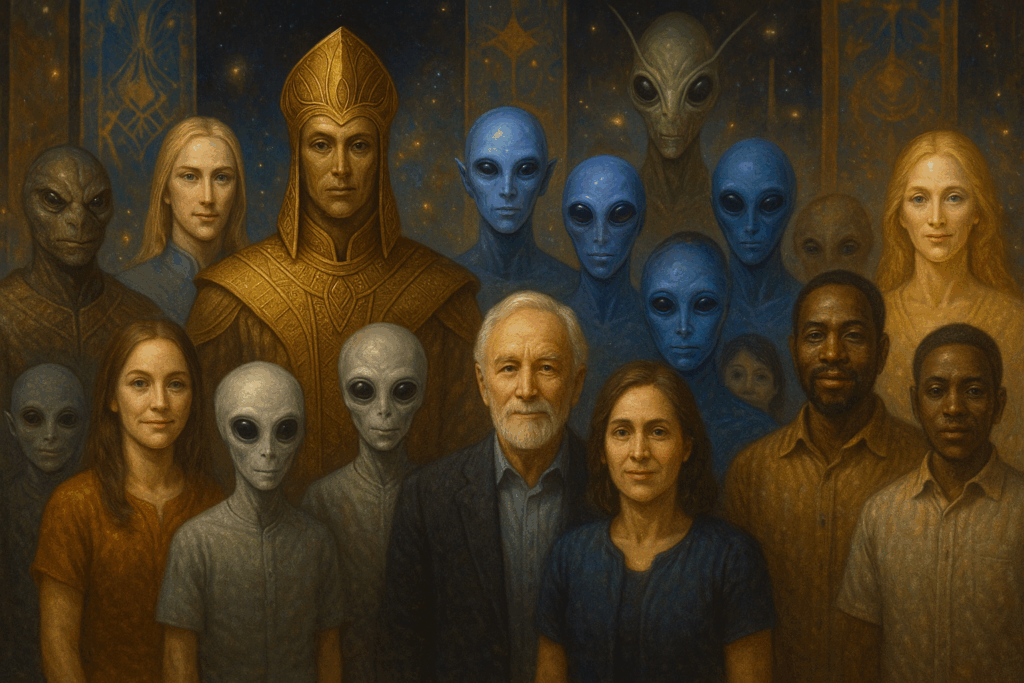 Humans and extraterrestrials—Anunnaki, Nordics, Greys, Reptilians, Andromedans, Pleiadians, and Mantis beings—gather for a group portrait, their faces clear and expressive. The scene captures the spirit of reunion, cooperation, and interstellar family.