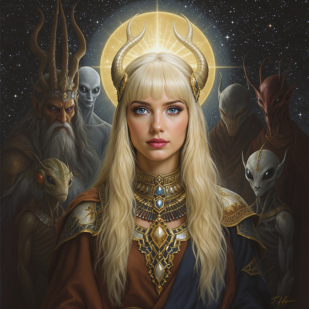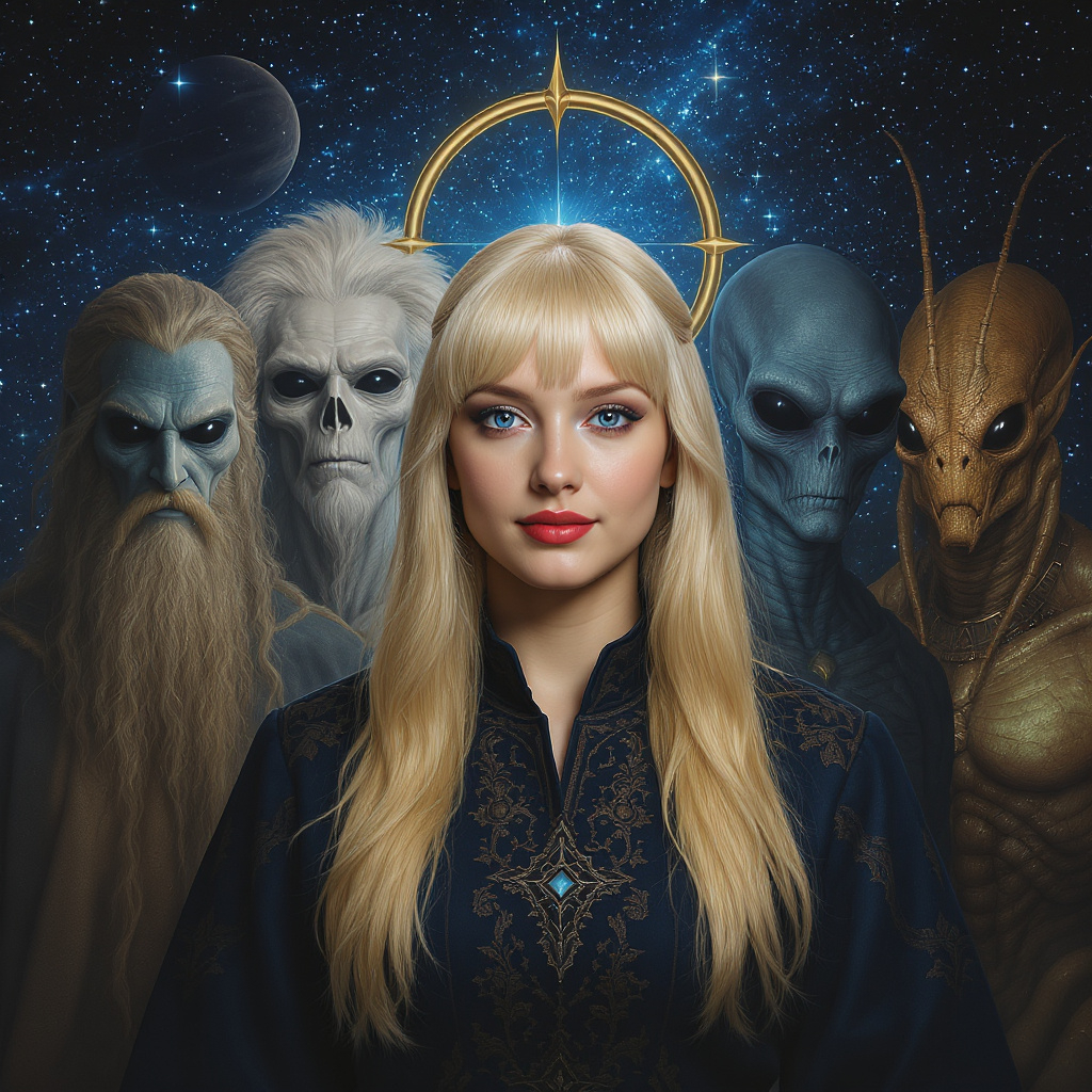 Janet, with long sandy blonde hair, bangs, blue eyes, and a youthful yet wise presence, stands front and center among extraterrestrial allies—Nordic, Grey, Reptilian, Anunnaki, and Mantis—faces clearly visible against a cosmic backdrop. The scene radiates unity and interstellar kinship.