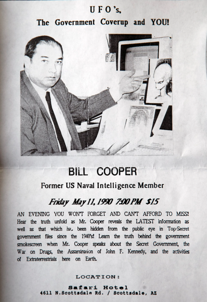 Years later, Cooper would use hypnosis to recall the documents in greater detail, he wrote in his book. They showed, according to Cooper, that the government had not only made contact with alien life, but also struck a deal to work with them to turn some portion of earthlings into slave labor. For that plan to work, Cooper said, the public would have to accept a global government.